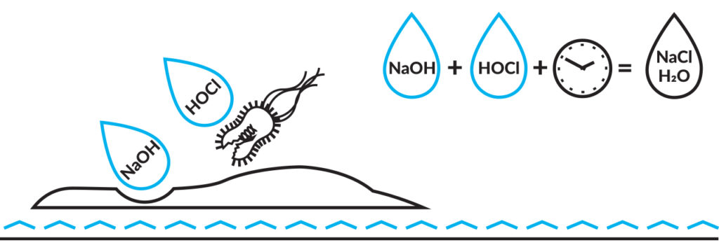 NaOH wirkt als Reinigungsmittel, das Schmutz entfernt, und HOCI wirkt als Desinfektionsmittel.